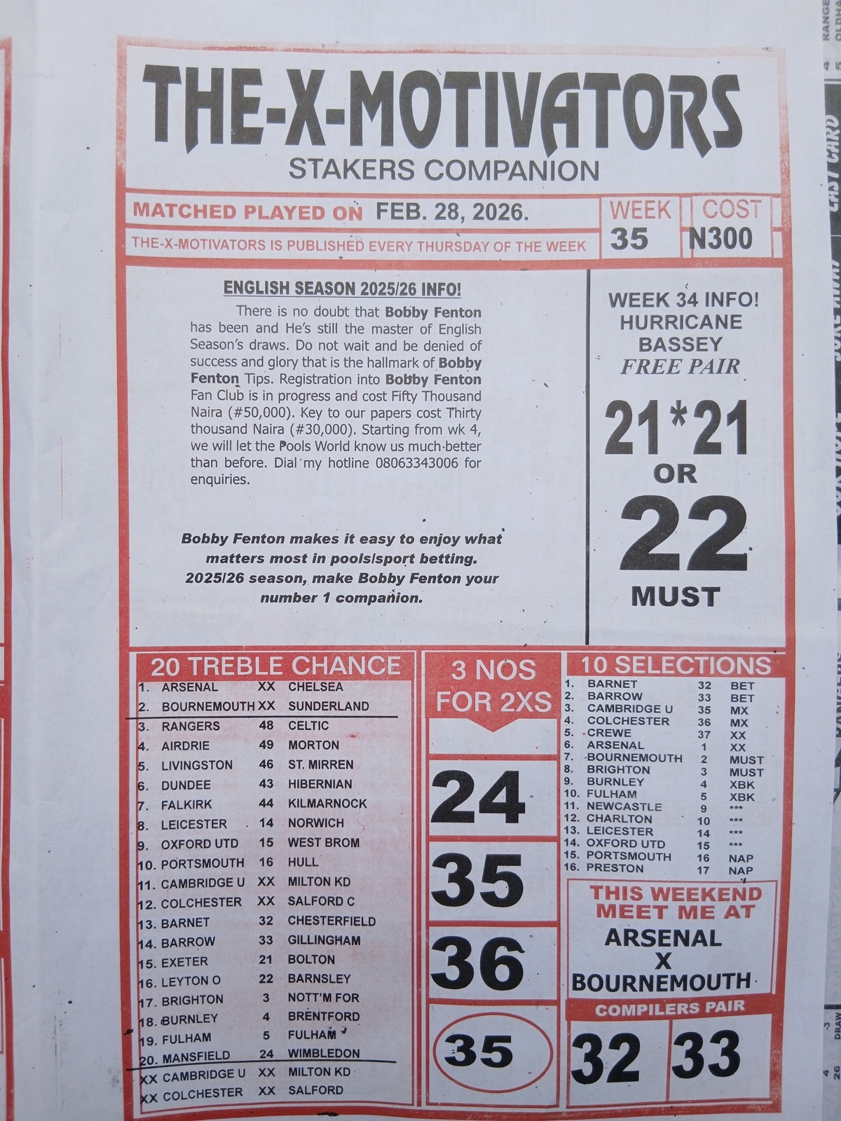 Week 35 Pool Late News Papers 2026: Sport Officer, Soccer Standard for matches scheduled on Saturday, 28 Feb 2026, in the UK 2025/2026 season.