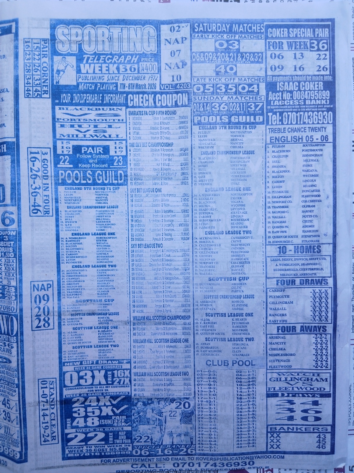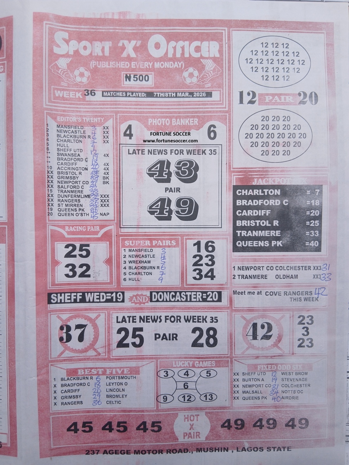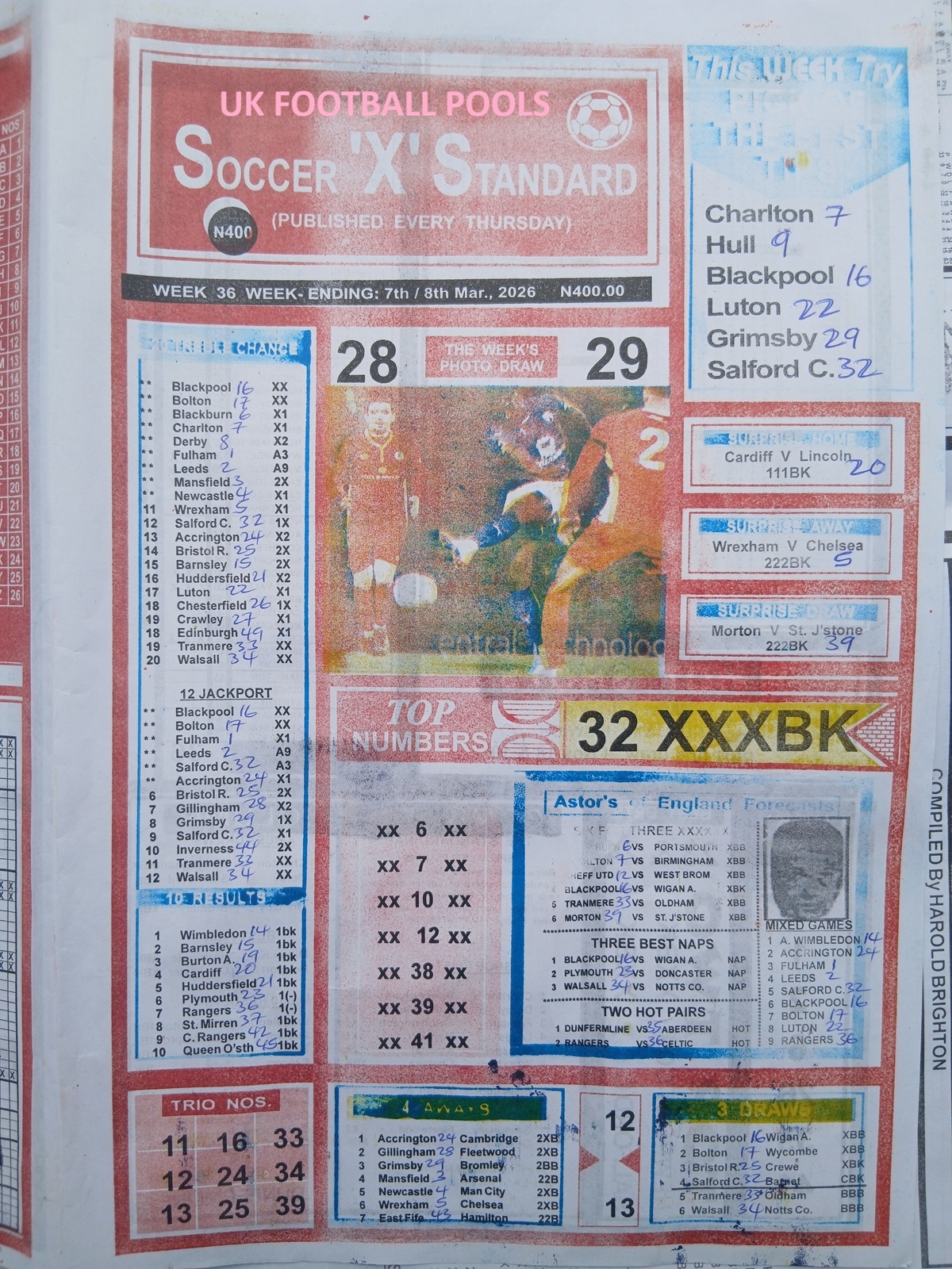 Week 36 Pool Late News Papers 2026: Sport Officer, Soccer Standard for matches scheduled on Saturday, 07 March 2026, in the UK 2025/2026 season.