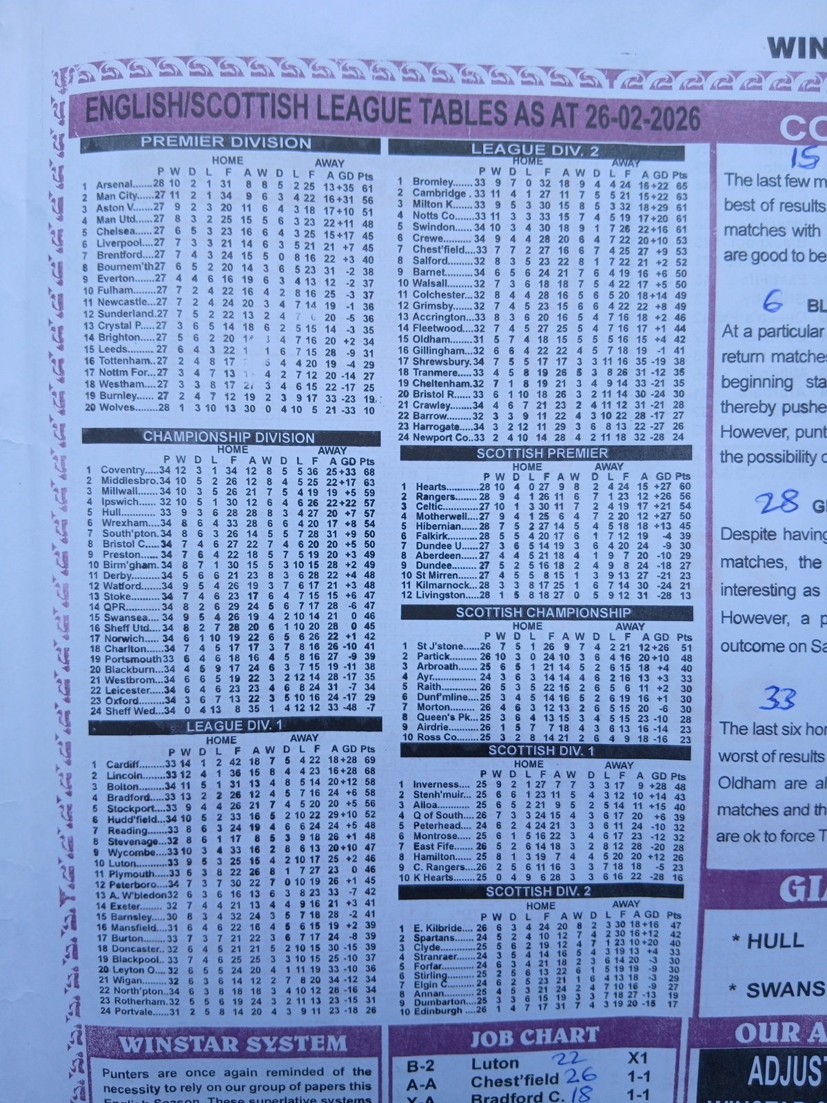 SOCCER PERCENTAGE, CAPITAL AND WINSTAR LEAGUE TABLES