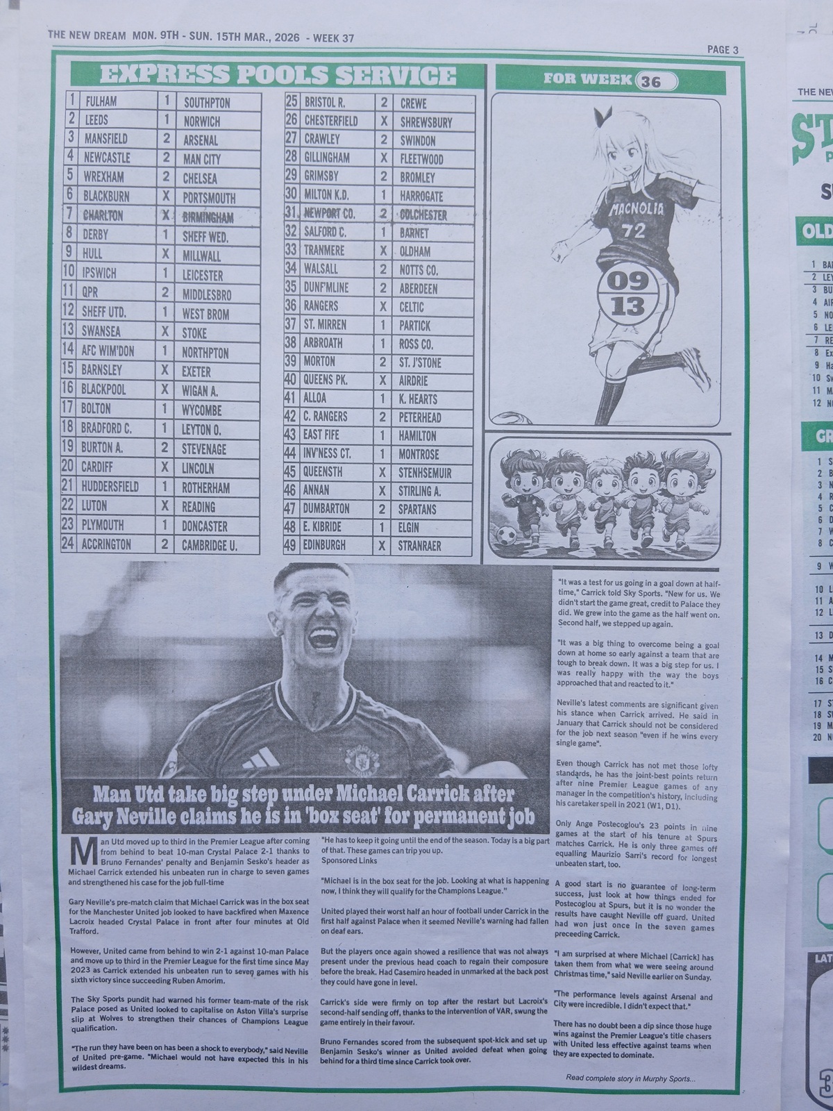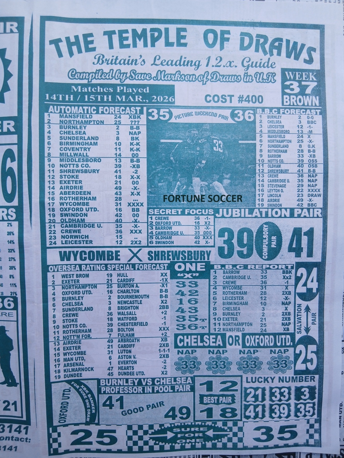 Week 37 Pool Late News Papers for matches scheduled on Saturday, 14 March 2026, in the UK 2025/2026 season.