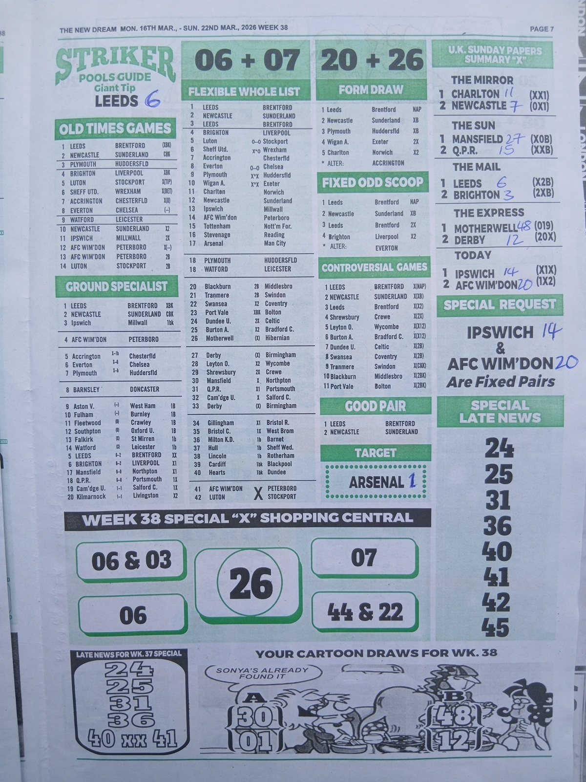 Week 38 Pool Late News Papers for matches scheduled on Saturday, 21 March 2026, in the UK 2025/2026 season.