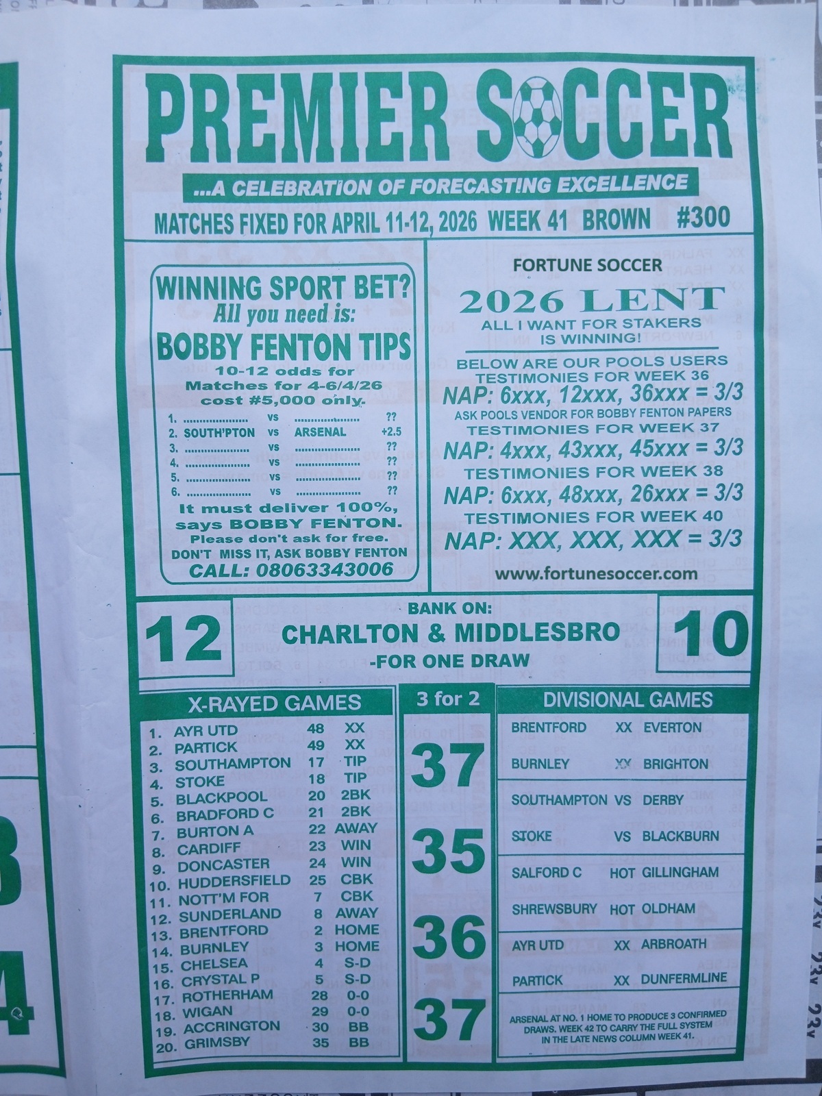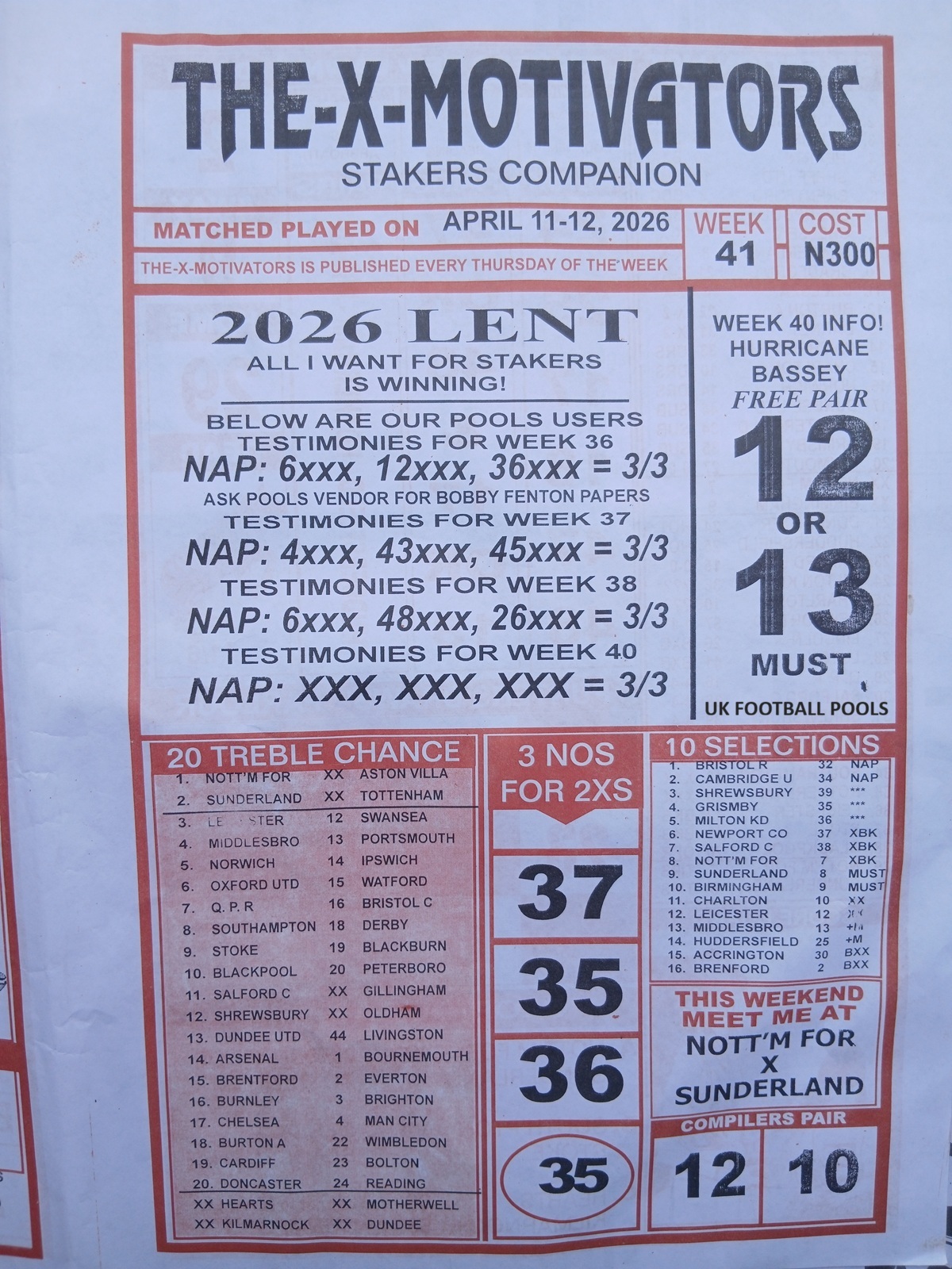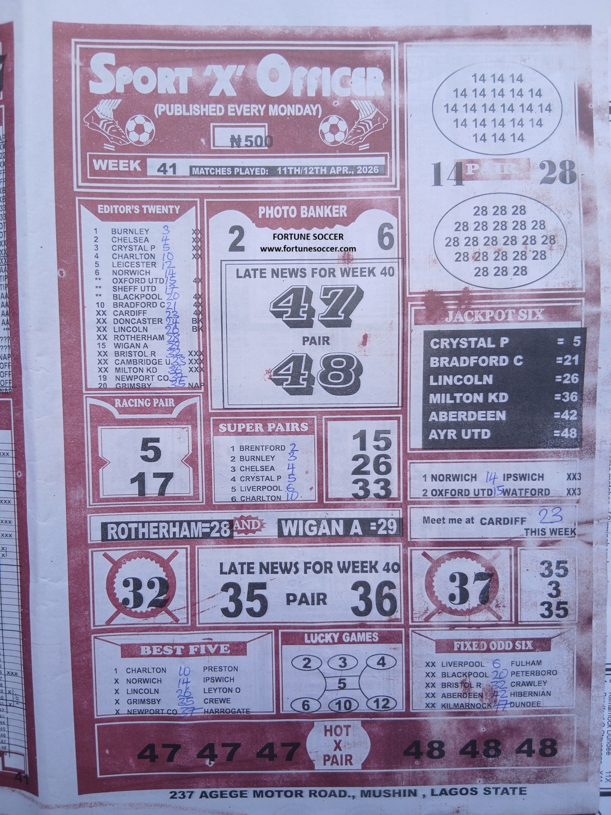 Week 41 Pool Late News Papers 2026: Sport Officer, Soccer Standard for matches scheduled on Saturday, 11 April 2026, in the UK 2025/2026 season.